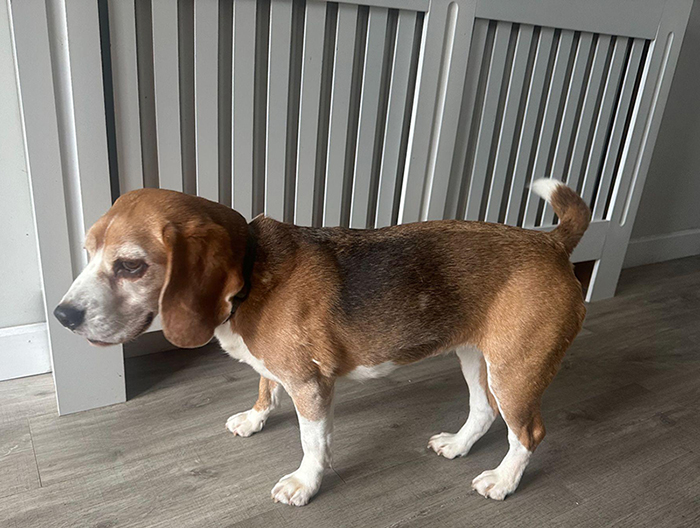 Blossom is a gentle, affectionate beagle with a lovely temperament. She enjoys human company, cosy spaces, and a steady routine. During the day she relaxes on the sofa, and at night she happily sleeps in her crate, which she sees as her safe space.