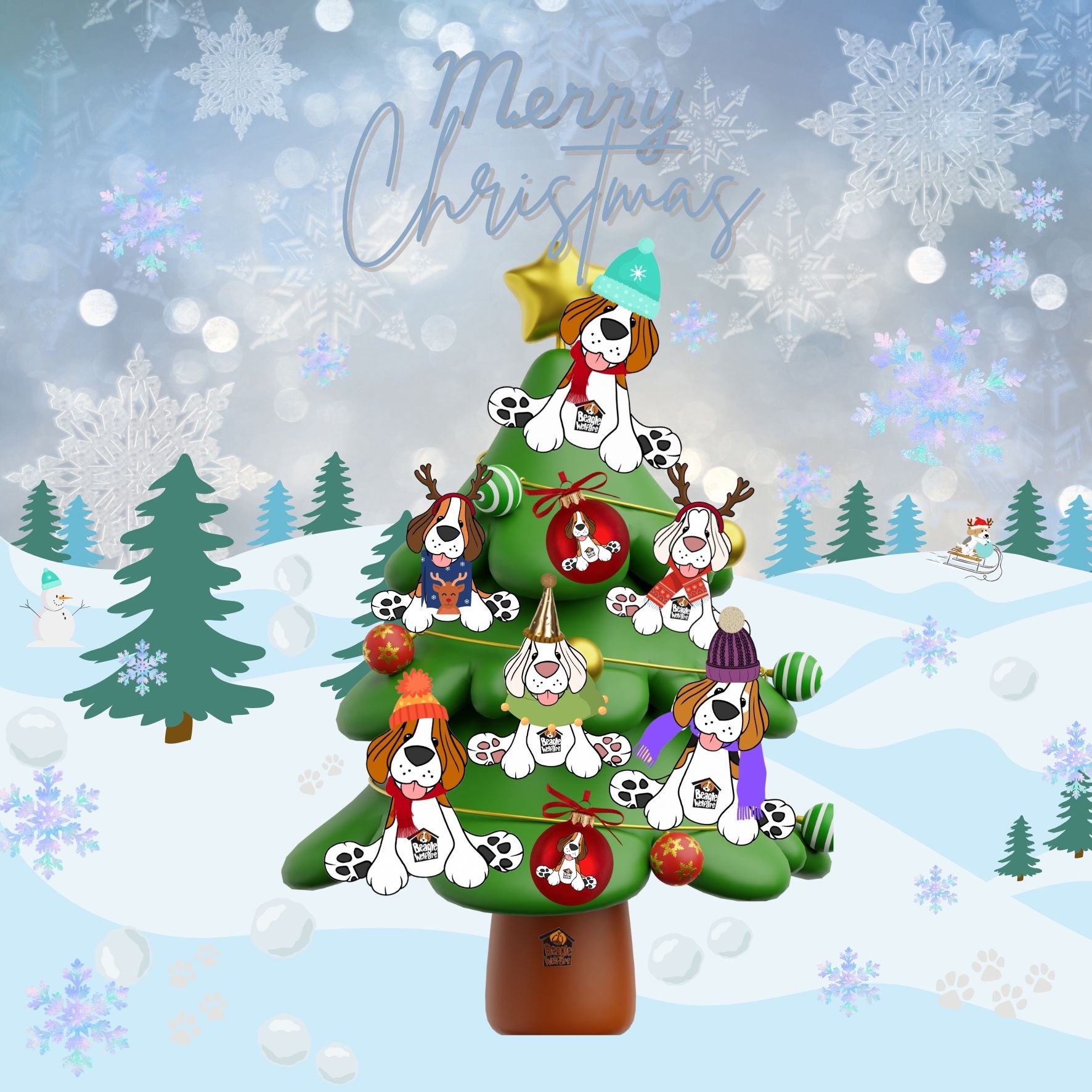 🎨 Featuring a joyful winter scene with Beagles dressed in their festive best—Santa hats, reindeer antlers, and scarves galore